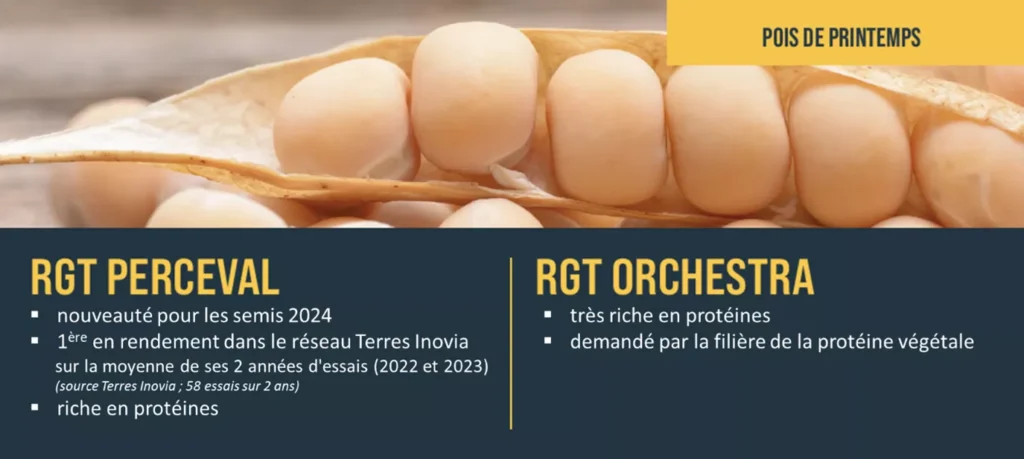 Leader mondiale degli ingredienti di origine vegetale, Roquette investe fortemente nella proteina vegetale a base di pisello giallo, per rispondere ai mercati dell’alimentazione, della nutrizione e della salute. Il pisello primaverile a grani gialli, attraverso le varietà RGT ORCHESTRA e RGT PERCEVAL, interessa naturalmente Roquette.